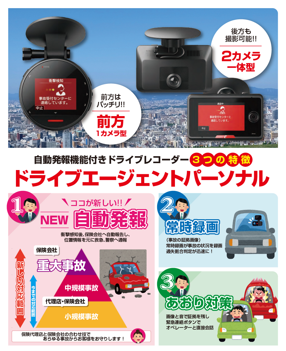 ③あおり対策→前後カメラ搭載のため、後方の録画が可能で緊急連絡ボタンでオペレーターと直接会話できます